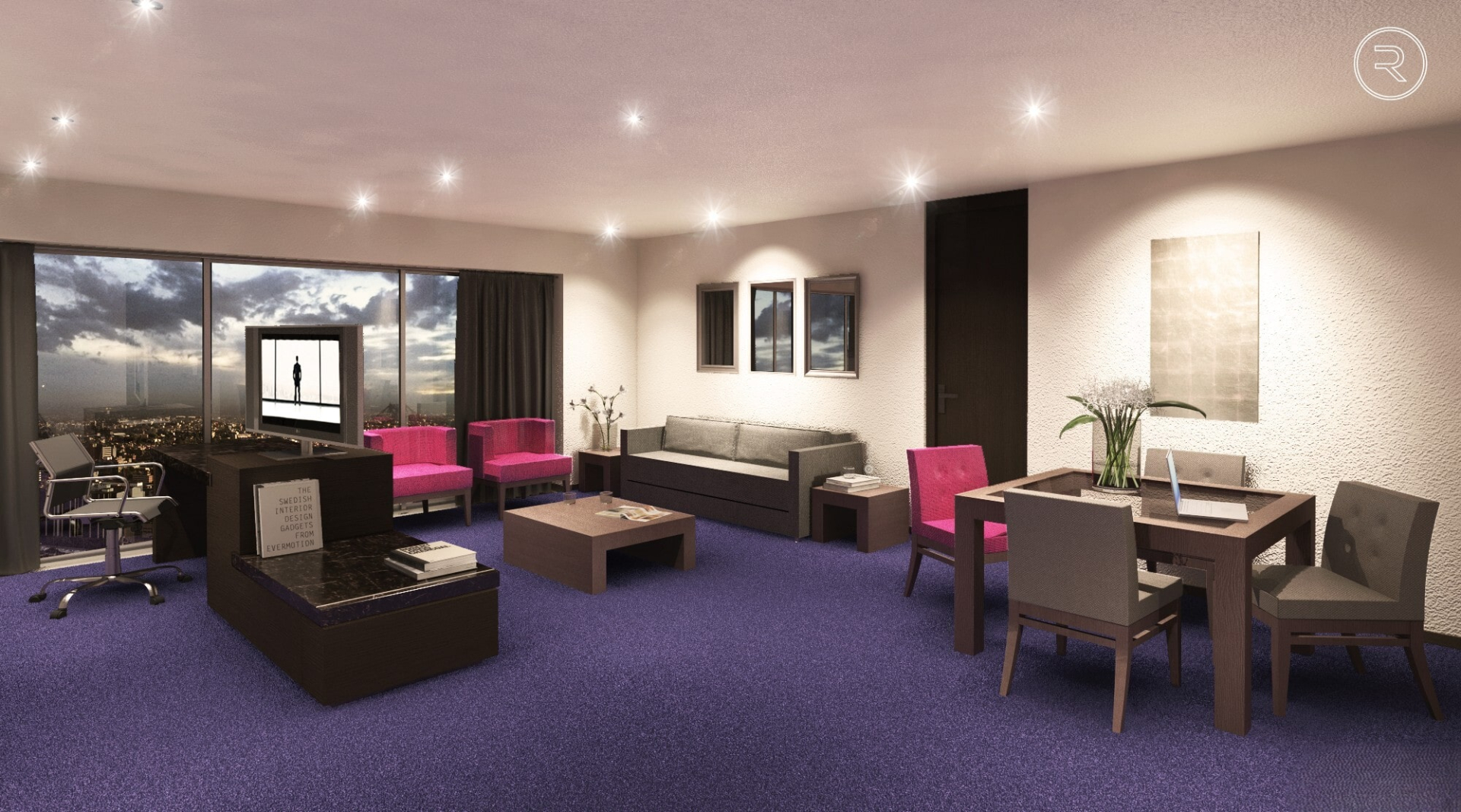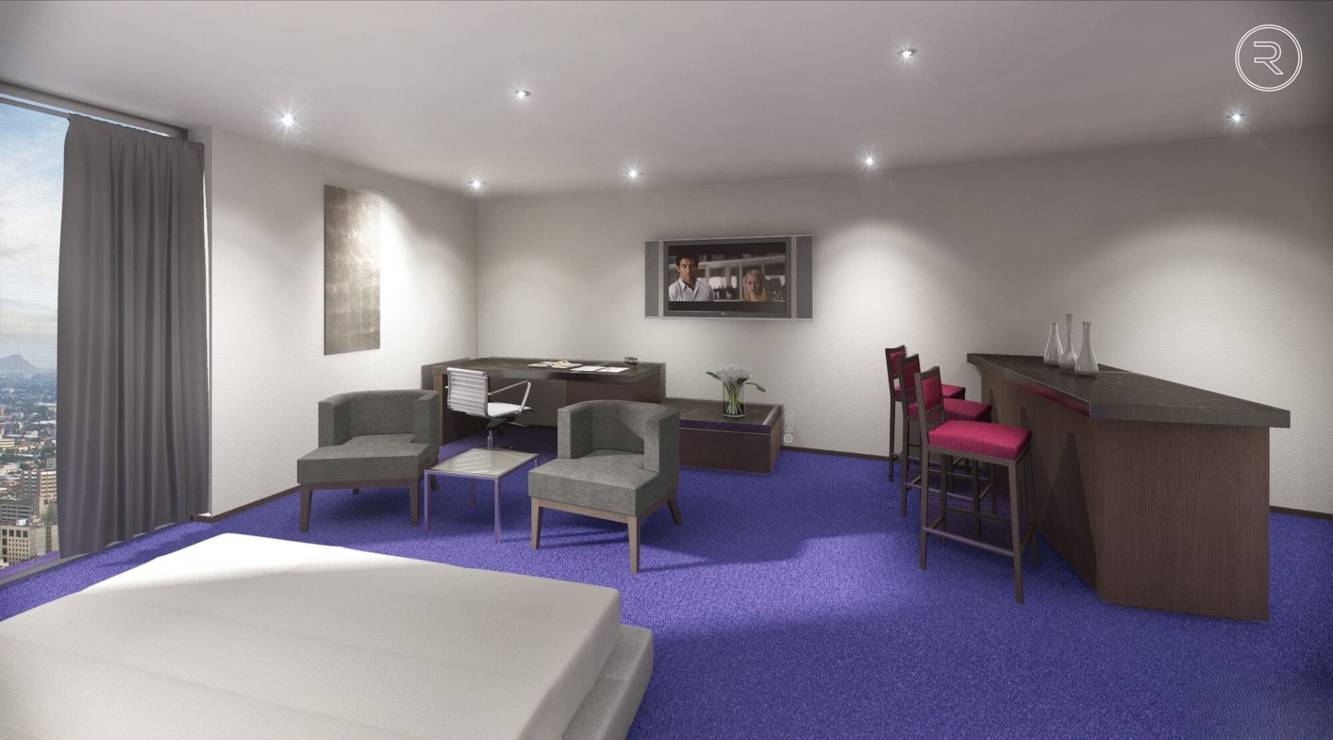 Nuestro equipo estuvo a cargo de la conceptualización del espacio, diseño interior y producción de renders, asegurando una propuesta visual coherente con la identidad del hotel. El propósito del proyecto fue generar una sensación de confort y funcionalidad, respetando los colores emblemáticos que caracterizan al arquitecto responsable de este espacio.