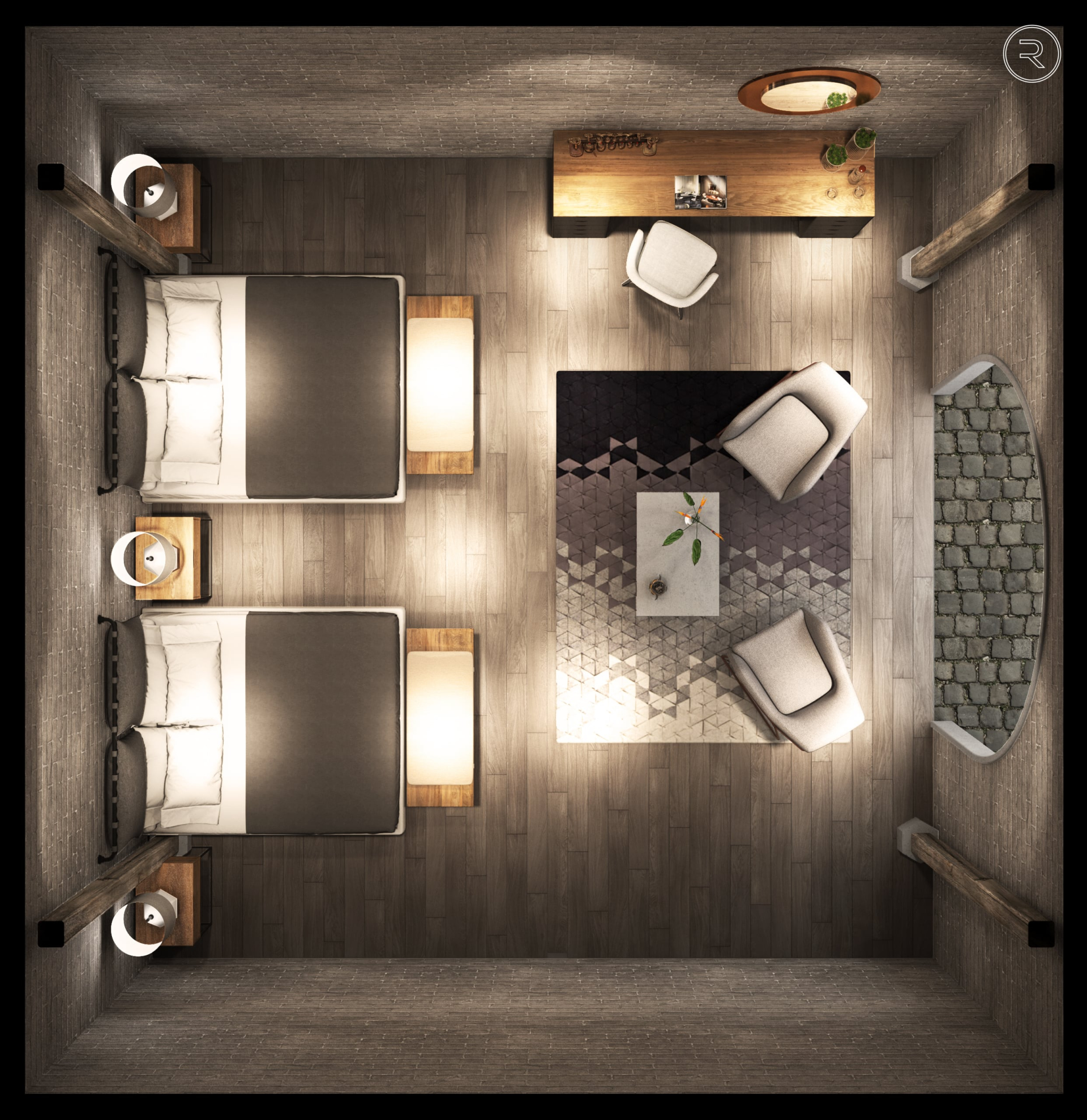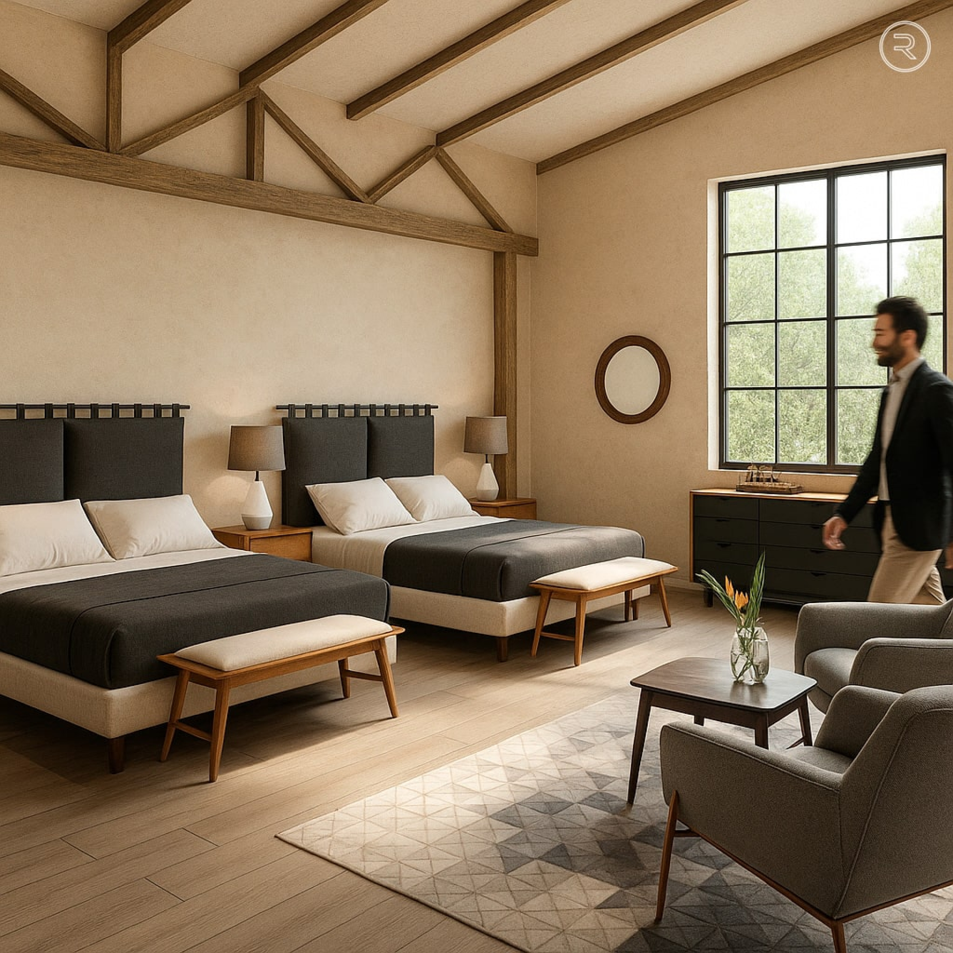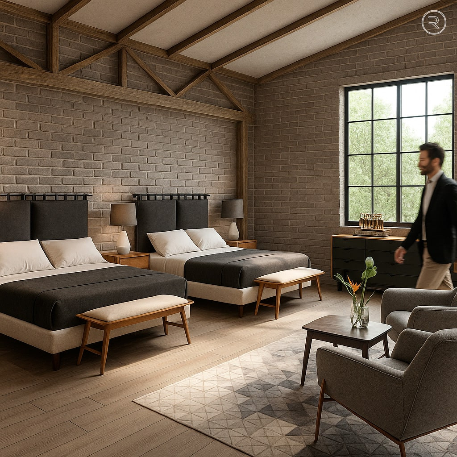Propuesta de interiorismo enfocada en crear habitaciones ejecutivas cálidas y contemporáneas, combinando texturas naturales, madera expuesta y una paleta neutra que transmite serenidad. Los espacios integran iluminación suave, mobiliario moderno y detalles artesanales que realzan el confort. El diseño busca equilibrar funcionalidad y armonía, ofreciendo una experiencia acogedora y elegante en cada villa.